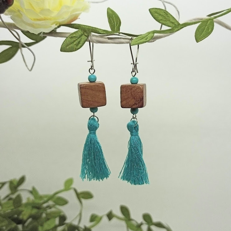 Image précédenteImage suivante lelemescreas.com BO boucles d’oreilles carré bois 11mm perles howlite turquoise pompon acier inoxydable bleu Lélé mes Créas