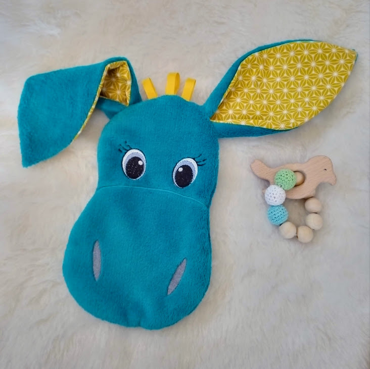 Image précédenteImage suivante lelemescreas.com DOUDOU PLAT El Burro Âne Douillette bleu canard pétrole et coton imprimé MOUTARDE Lélé mes Créas